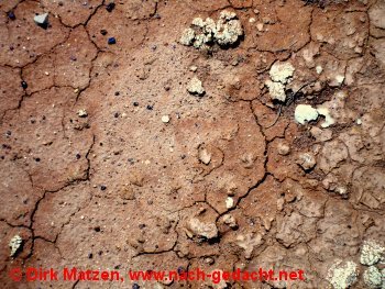 erkennen: Eine großflächige, austrocknete Kruste zeugt davon, dass es kräftige Regenfälle gegeben haben muss und hier das Wasser dann offenbar auch mal längere Zeit