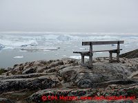 Jetzt bin ich also bei der "Mutter des Meeres" zu Besuch, ein Stück oberhalb gibt es zwei Bänke, beide sind frei. Da lasse ich mich nieder. Sonne - wie schön! Und sie wärmt, sogar in Grönland! Eine Wohltat! Runter mit der Jacke... Genießen. Und schnell doch wieder zu kühl.