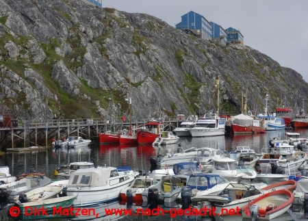 Der Fischereihafen von Nuuk, direkt neben einem 35 m hohen Felsen. Die Aussicht von den Häusern dort oben ist allerdings sensationell...