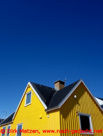 Wow! Was für eine plötzliche, totale Änderung des Eindrucks von Nuuk. Was für eine grandiose Umgebung diese Stadt hat. Das konnte ich bisher bestenfalls ahnen. Plötzlich ist der Ort wunderschön, wie magisch - also ehrlich: Da gehe ich doch jetzt nicht in ein Museum! Wer weiß schon: Vielleicht geht dieser blaue Himmel ja auch wieder so schnell, wie er gekommen ist? Grund genug, Nuuk jetzt nochmal ein wenig neu zu erkunden. Diesmal mit leuchtenden, frischen Farben allerorten und einem Knallblau darüber. Da wirkt alles gleich viel strahlender, teilweise fast von aufdringlicher Schönheit. Meine Stimmung steigt sprunghaft an.