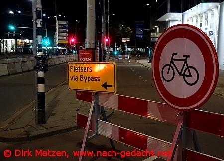 Daheim heißt es bei Baustellen seit dem letzten Jahrhundert auch heute immer noch: "Radfahrer absteigen!" In Rotterdam jedoch überlegt man sich rechtzeitig klare, sichere Lösungen für eine Umleitung in solchen Fällen.