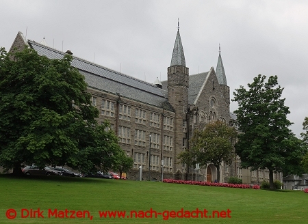 Einen Schlenker mache ich dann bei Gelegenheit noch zu dem markanten Hauptgebäude der "Technisch-Naturwissenschaftliche Universität Norwegens – NTNU", das mir schon bei einem Blick über den Nidelv in Auge gesprungen ist. Viel los ist hier nicht - es ist ja auch die vorlesungsfreie Zeit für die Studierenden. Gut gefallen mir die paar historischen Lokomotiven, die man als Ausstellungsobjekte hierhin transportiert hat. Der Blick über die Stadt ist aber nicht so toll, wie ich gehofft habe.