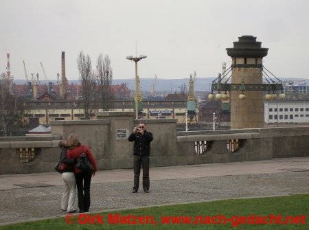 Aber nicht nur viel Grün ist markant für Szczecin - auch das Wasser. Schließlich liegt die Stadt an der Mündung der Oder in das Stettiner Haff und somit letztlich in die Ostsee. Ein großer Seehafen beherrscht das Bild der Stadt weitgehend mit. Viel Schiffsverkehr konnte ich, in Zeiten der Weltwirtschaftskrise, allerdings nicht feststellen. Als Hamburger habe ich diesbezüglich wahrscheinlich auch eine nicht ganz vorurteilsfreie Wahrnehmung... Was ich jedoch deutlich wahrnehme, sind die Gerüche, die der böige Wind zumindest am Samstag aus Richtung Hafen zu mir herüber weht. Nicht alles ist angenehm - und auch stundenlanger Kakaogeruch wirkt irgendwann abstoßend...